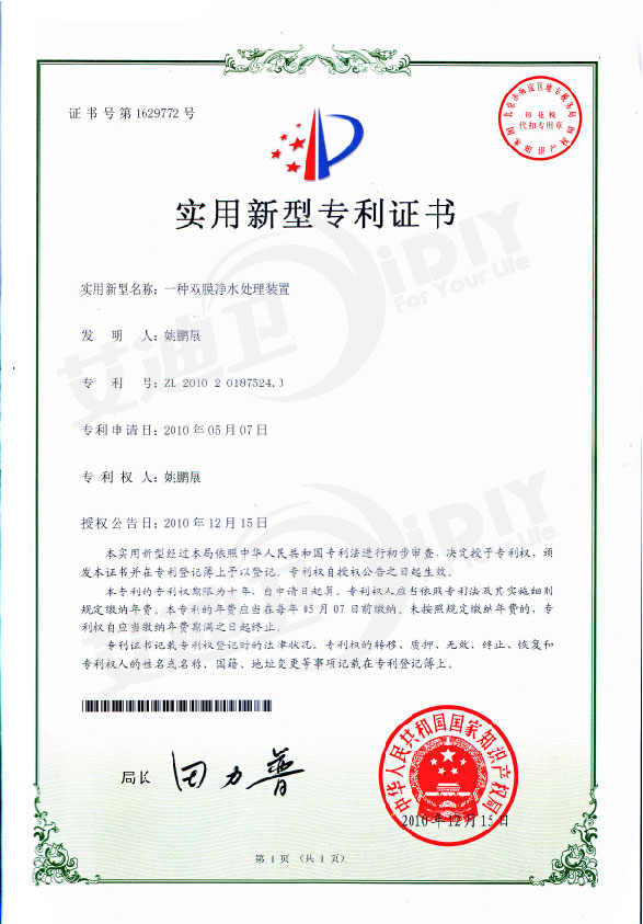 艾迪卫双膜净水处理装置荣获实用新型专利