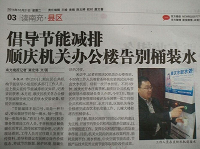 新疆乌市、四川南充等地政府机关办公楼已开展节约型公共机构示范单位建设,以点带面促进工作,发挥公共机构节能示范及表率工作。艾迪卫节能直饮水设备有幸参与到节能减排直饮水设备安装项目中,并试点成功,为国家的节能减排工作尽一份绵薄之力!(如下图为安装现?。?/span>